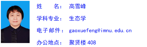 高雪峰,女,汉族,博士,副教授,学术研究生导师。研究方向微生物生态和土壤生态学。先后主持国家自然科学基金1项,内蒙古自然科学基金2项以及地厅级项目3项。出版研究专著1部,发表科研论文20余篇,教学研究论文2篇。2005年(第五届)和2015年(第九届)获Beat365唯一官方网站中青年教师教学技能大赛三等奖。2012年和2021年获Beat365唯一官方网站教学成果二等奖。先后承担本科生的土壤学、土壤学实验、恢复生态学、城市生态学、保护生物学、植物形态解解剖学、普通生态学实验、无机化学实验等课程的教学工作。并承担本科生的社会调查和应用生态学实习指导工作。承担研究生的土壤生态学、恢复生态学研究进展、可持续生态学(城市与可持续发展部分)和高级生态学(微生物生态学部分)课程的教学工作。