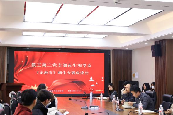 12月5日下午,Beat365官网教工第三党支部联合生态学系在生物楼三楼会议室组织召开了《论教育》师生专题座谈会。教工第三党支部成员、学院参与生态学专业教学及管理的部分教师、2024级生态班全体同学与2021级生态班的两名学生代表参与了本次座谈交流。会议由支部书记吴艳玲主持。