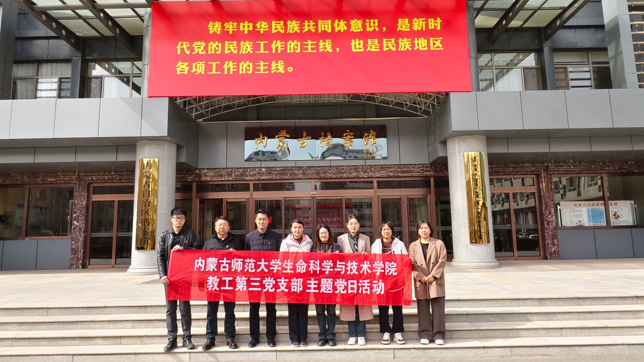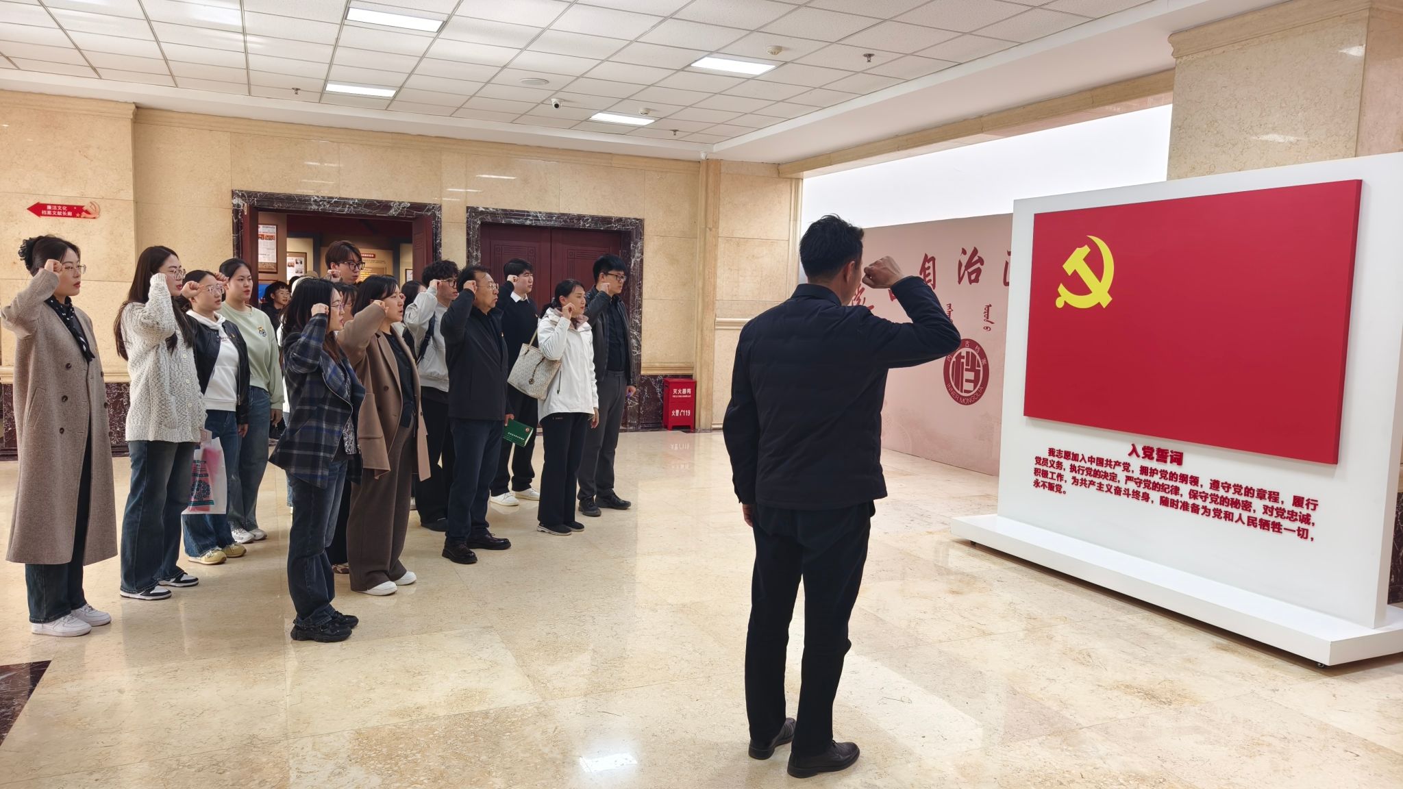 在铸牢中华民族共同体意识档案文献展中,党员们深入了解了内蒙古自治区各族人民在党的领导下团结奋斗、共同发展的光辉历程。展览充分体现了中华民族多元一体格局的发展脉络与团结精神,进一步增强了党员的政治认同、文化认同和历史责任感。活动最后,全体党员在党旗下庄严肃立,重温入党誓词。铿锵有力的誓言再次唤醒初心、坚定信仰,增强了遵规守纪的自觉性和干事创业的使命感。