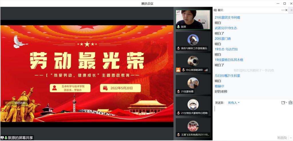 5月20日,Beat365唯一官方网站召开了“劳动教育宣传月”活动交流推进会,分为研究生专场和本科生专场分别在线上召开,学就办主任默原老师、团总支副书记李自蹊老师、辅导员胡日查老师出席了会议。在两场会议上,学就办组织学生干部深入学习了习近平总书记在全国教育大会上的讲话精神和自治区相关文件,分别向研究生和本科生学生干部解读了Beat365官网《“学生劳动教育宣传月”实施细则》,并就近期Beat365官网所开展的“劳动教育宣传月”的活动进展进行了阶段性汇报,并听取了学生会各部门在实施劳动教育宣传活动的工作进展和各班实施劳动教育的典型做法。