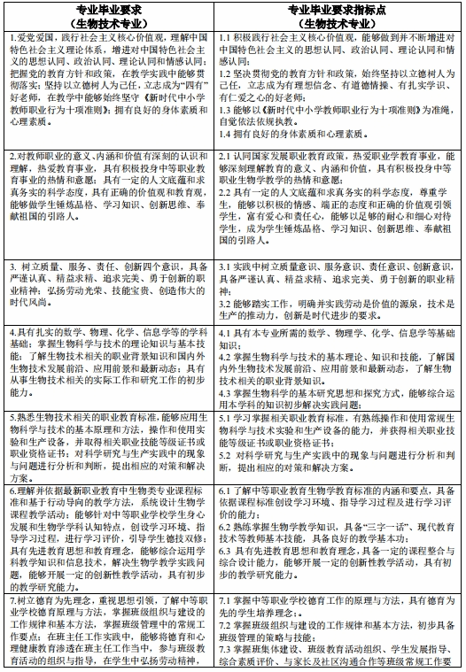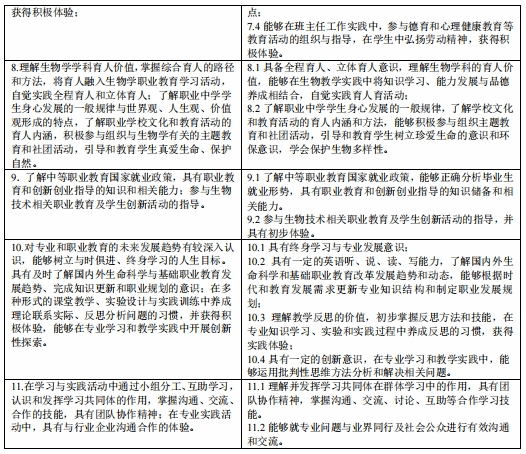 目标2:具备扎实的生物学理论基础和实验实践能力,具备先进的教育方法和教学技能;能够综合运用所学知识和技能,结合现代教育思想、教育理念和其它相关学科知识,进行职业生物学教学、管理以及教学资源开发等教育教学研究;具有综合运用所掌握的理论知识和技能从事生物技术及其相关领域的产品生产、技术研发、科学研究的能力。