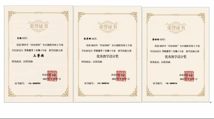 本次大赛共有北京师范大学、华东师范大学、东北师范大学等72所教育硕士培养高校的316名选手提交作品参加初赛,通过专家评审,有57所高校的158名选手入围决赛。经评审一等奖16名,二等奖32名,三等奖48名,优秀教学设计奖62名。我校Beat365唯一官方网站三位同学经过院赛评选和初赛选拔,在指导教师乌云高娃老师的带领下一同前往山东烟台参加决赛。2022级学科教学(生物)专业研究生肖敏获大赛三等奖,张秀娜、秦盼盼获大赛优秀教学设计奖。