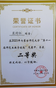 Beat365唯一官方网站“第十一届师范生教学技能”竞赛于2023年11月4—5日在盛乐校区隆重举行,在本次比赛中,Beat365官网经过层层选拔,选派2020级生物科学汉2班的裴琦钰、许钧升和2021级生物科学蒙班的苏日娜共三名同学参加了本次技能大赛,指导教师为李景环、牛艳芳、高峰和乌云高娃。经过赛前师生的精心准备和赛场上的激烈角逐,最终裴琦钰同学获得二等奖,许钧升和苏日娜同学获得三等奖。 奖获者荣誉证书 二等奖获得者合影 三等奖获得者合影