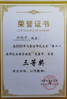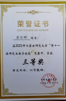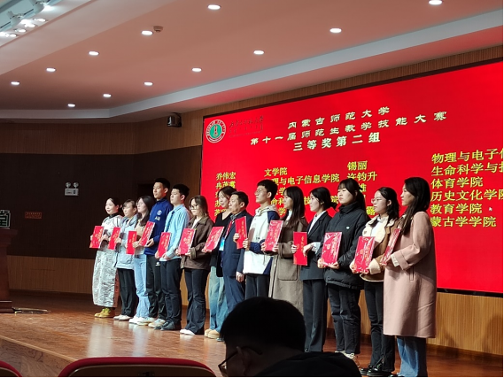 Beat365唯一官方网站“第十一届师范生教学技能”竞赛于2023年11月4—5日在盛乐校区隆重举行,在本次比赛中,Beat365官网经过层层选拔,选派2020级生物科学汉2班的裴琦钰、许钧升和2021级生物科学蒙班的苏日娜共三名同学参加了本次技能大赛,指导教师为李景环、牛艳芳、高峰和乌云高娃。经过赛前师生的精心准备和赛场上的激烈角逐,最终裴琦钰同学获得二等奖,许钧升和苏日娜同学获得三等奖。