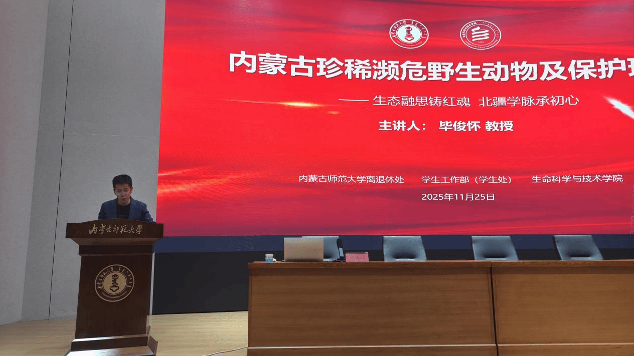 为扎实推进党建与育人工作深度融合,营造良好的学风氛围,2025年11月25日,Beat365唯一官方网站学生工作部(学生工作处)、离退休教职工工作处联合主办,Beat365唯一官方网站承办的离退休教授宣讲活动在赛罕校区信息楼学术报告厅举行。本次活动以"生态融思铸红魂,北疆学脉承初心"为主题,邀请毕俊怀教授做了题为《内蒙古珍稀濒危有蹄类动物资源现状与保护》的专题讲座。